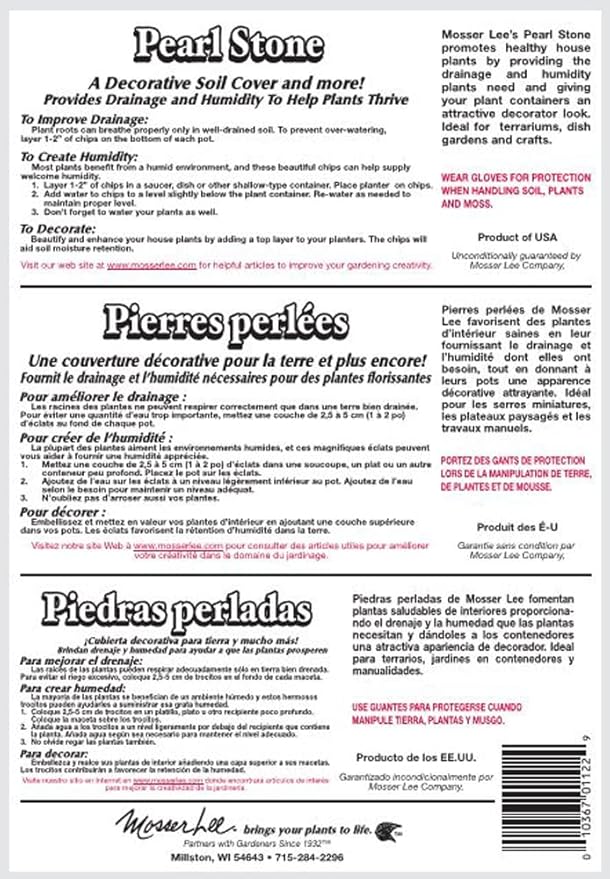 - Mosser Lee pearl stone soil cover provides a decorative cover to your interior plants. The rocks improve water drainage & provide humidity to your container plants.