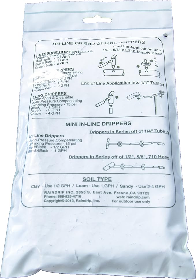 - COLOR CODED: Comes with fifty 2 GPH Pressure Compensating Drippers; Color coded for easy identification of flow rate: red – ½ GPH, ideal for heavy soil/clay areas; black – 1 GPH, ideal for medium soil/loam; green – 2 GPH, ideal for sandy soil
