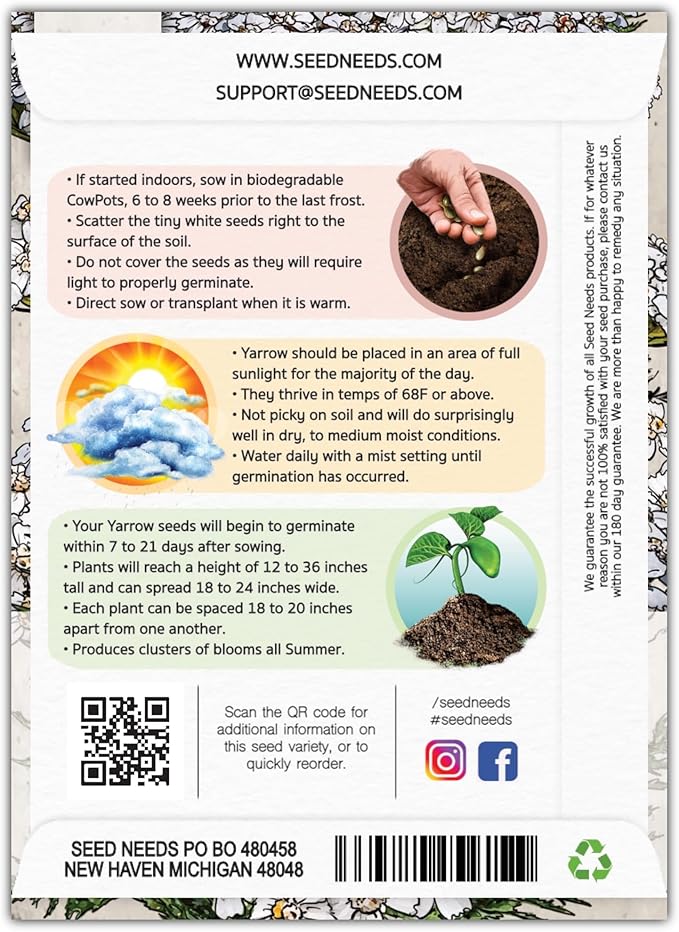 Seed Needs, White Yarrow Seeds - 500 Heirloom Seeds for Planting Achillea millefolium - Perennial Host Plant to Attract Monarch Butterflies & Other Pollinators (1 Pack)