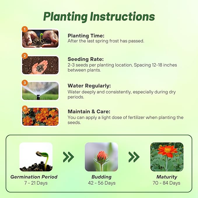 - STUNNING ORANGE BLOOMS: Our Mexican sunflower seeds produce 3-inch, vibrant orange flowers that brighten flower beds, borders, and landscaping designs. These blooms are also great as cut flowers, enhancing arrangements with bold color. Perfect for gardeners seeking flower seeds to plant outside.