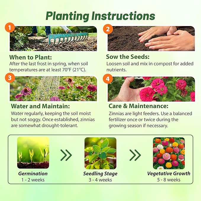 - EASY-TO-GROW VARIETY: Each zinnia seed thrives in warm climates, blooming in just 6–8 weeks. Perfect for zinnia mix collections or standalone displays, they grow best in full sun and well-drained soil, adding charm to drought-friendly gardens with minimal care.