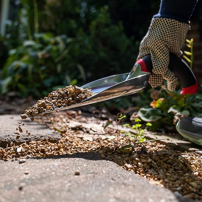 - Wide garden trowel for mixing soil, filling pots, planting larger liners, transplanting, and even stirring hot coals in your outdoor grill