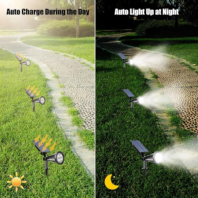 - 【Intelligent Pattern】 -- The Solar Spotlights has 2 modes--The High Light Mode will Last for 8-10hrs after Fully Charged. The Low Light Mode will Work for 14-18hrs after Fully Charged. What's More, T-SUN Solar Lights has an Automated Switch-Auto on at Night/Auto off at Sunrise.