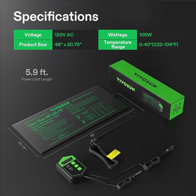 - Innovative Heating: With the radiate far-infrared light wave, this seeding heat mat makes the heat source softer and provides enough heat, which can be heated up to 40 ℃(104℉)at an ambient temperature of 20-25 ℃(68-77℉)in minutes; We recommend using it with the VIVOSUN thermostat controller and humidity dome