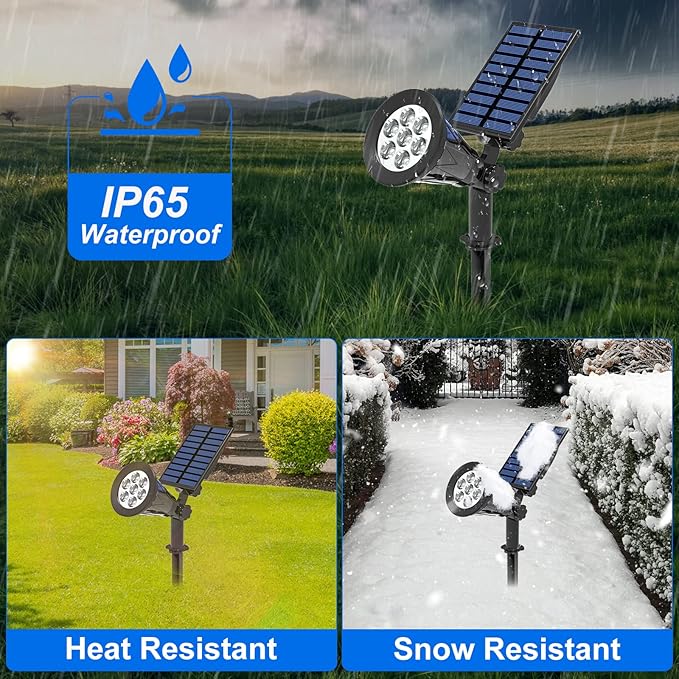 - 【IP55 Rating】 -- The solar spot lights designed to withstand dust and water jets. No need to worry about rainy day or any bad weather, rugged and durable. Perfect for garden, patio, driveway, pool area, pathway etc..