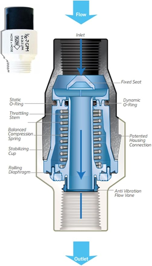 - Proper use of this low flow water regulator maintains sprinkler or droplet flow, distribution uniformity, and the overall efficiency of an irrigation system. It also helps conserve water and energy and extend sprinkler and drip system life in your garden or nursery. Works with any standard 3/4" outdoor faucet, hose bib, garden hose, water hose, sprinkler manifold, garden soaker hose or home irrigation system.