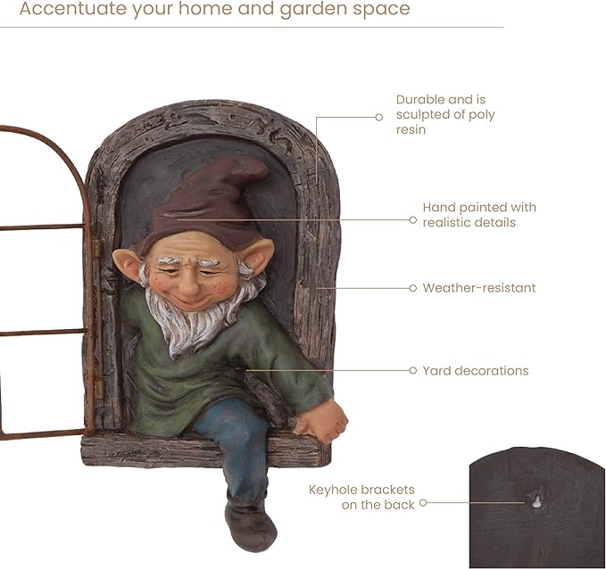 - Weather Resistant Decor: Elf out the Door Tree Hugger is durable and is sculpted of poly resin that can resist outdoor weather conditions. It is hand painted with realistic details and texture making it a great piece of yard decoration