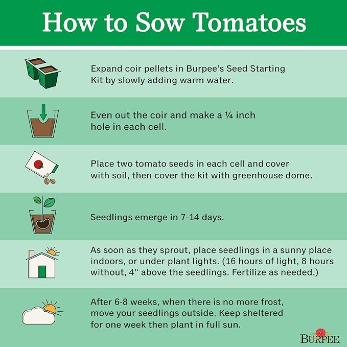 - SEED STARTING TIP: Sow tomato seeds indoors 6-8 weeks before average last frost. Harden off young tomato plants by leaving them outdoors in their containers up to a week before transplanting, after all danger of frost.