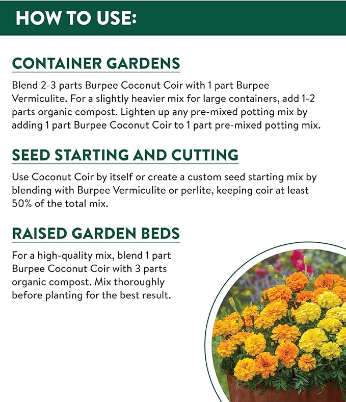 - IDEAL FOR PLANT GROWING: Use Burpee Organic Coconut Coir to grow your favorite flowers, herbs, vegetables and fruit in raised garden beds or containers. The fluffy, all-natural coir is also ideal for starting seeds in your house or for use in your indoor herb garden. Handy 8-quart bag size.