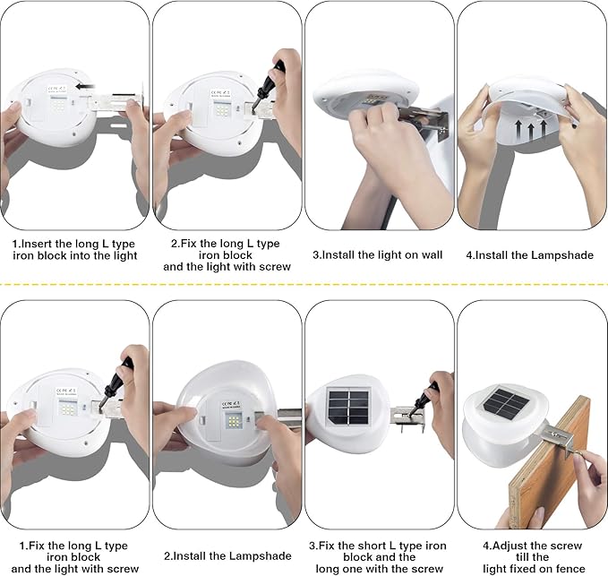 - 2 Different Installation Methods: This solar lights outdoor can be fixed on wall or pathway by single bracket (the long one or the short one), the solar deck lights also can be clipped on fence or gutter by two brackets. No annoying wires or adapters needed