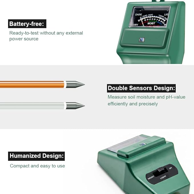 Soil pH Meter, MS02 3-in-1 Soil Moisture/Light/pH Tester Gardening Tool Kits for Plant Care, Great for Garden, Lawn, Farm, Indoor & Outdoor Use (Green)