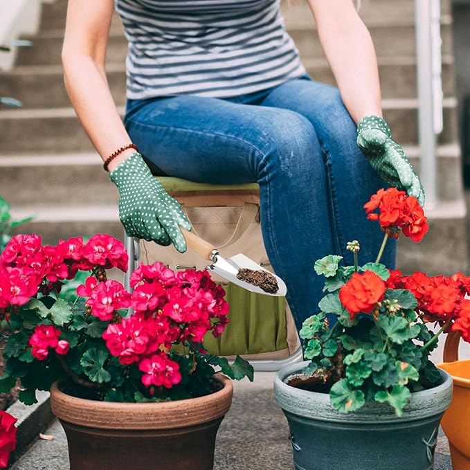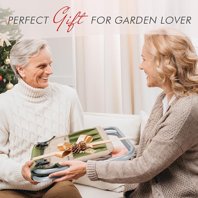 - 【What's in The Garden Tools Set】 Trowel, weeder, transplanter, rake, cultivator, pruning shears, plastic garden sprayer, rubber gloves with polyester, removable tote bag, 98ft bind line, foldable seat.
