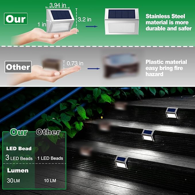 - High Efficiency-Durable Use: The solar deck light's panel made of high quality monocrystalline silicon, conversion up to 18%, long lasting support to light up till dawn.3 LED beads are not too dark and not too bright,light is not too harsh and will not affect your neighbors,enough for fence, deck railing, step, stairs, path, yard and garden, make your house more brighter and safer, don't worry about strangers approaching.