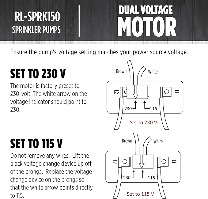 - DUAL VOLTAGE MOTOR: 115/230 Volts; pump is factory set at 230 Volts but can be easily switched to 115 Volts; always match the pump's voltage to the source voltage