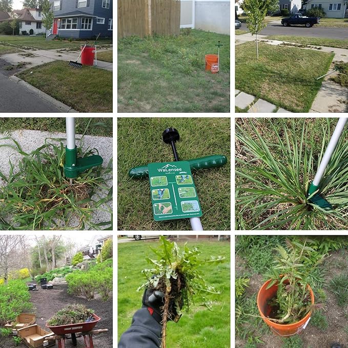- Standup Weeding Tool For A Better Gardening Experience: Get rid of weeds with this long handled lawn weeding tool. The 39” tall handle lets you uproot the weeds without having to bend over or go down to your knees. The foot pedal lets you put enough force on the gardening weed extractor to penetrate the ground and grab the whole weed, including the roots, so it doesn’t grow back. It is good tools for your garden, backyard, frontyard landscaping
