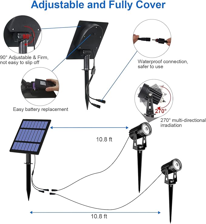 - [ Adjustable & Fully Cover ] 270° Adjustable dual headlight with a separate solar panel, and the line between the landscape lights and the solar panel is 10.8 feet long, it's not only able to illuminate your desired spot but also to get optimum sun exposure. Extra 5m extension cable available: Please search ASIN B095314R6J.