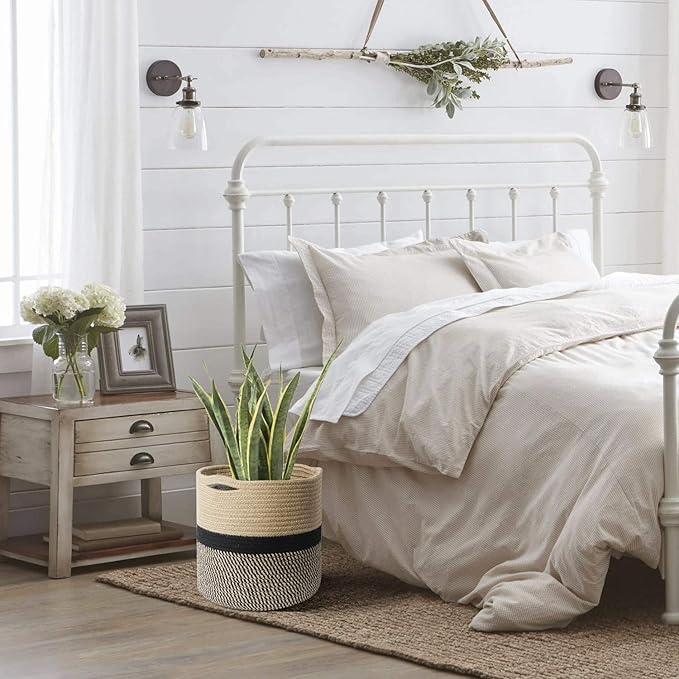 TIMEYARD Sturdy Jute Rope Plant Basket Modern Woven Basket for 10" Flower Pot Floor Indoor Planters, 11” x 11” Storage Organizer Basket Rustic Home Decor, Black and Beige Stripes