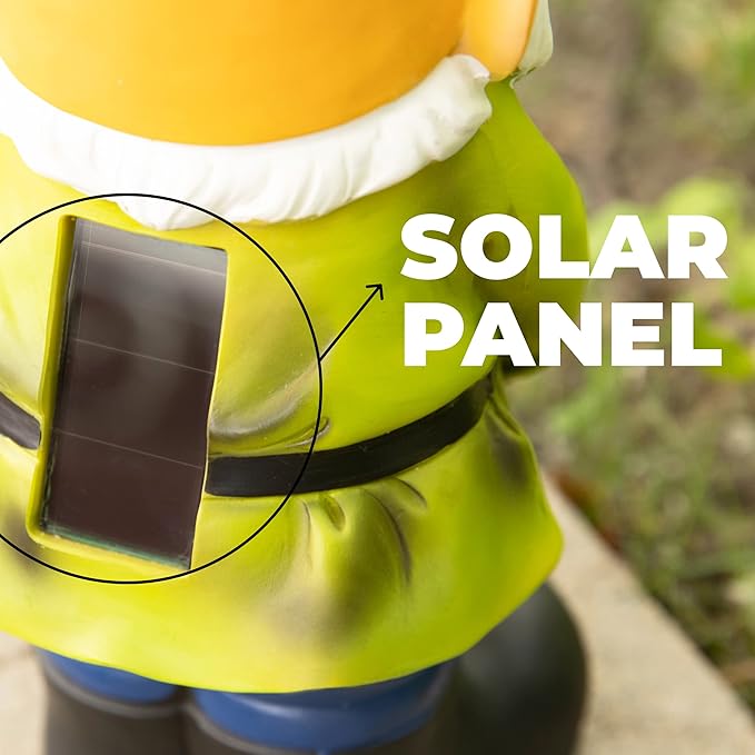 - Our solar gnome garden statue is crafted from durable resin & glass to last year after year. and it includes Rechargeable battery. Put this charming statue anywhere and add fun to your patio and yard.