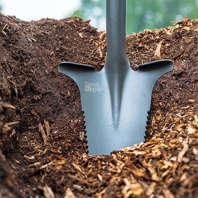 - Root Slayer mini digger with an inverted V-shaped cutting tip that is designed to rip through dirt, roots and other minor obstructions in the soil without the use of other gardening tools