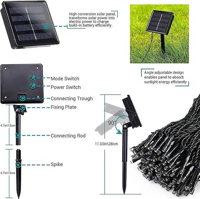 - Easy to Install and Operation - Solar panel with ground stake, 72ft long string is perfect for wrapping around a tree or wherever you like to light up your garden, patio, lawn, porch, gate, yard, fence, balcony, etc. The wire between the first LED light and the solar panel (lead cable) is around 6.5 ft, so you can put the panel in a suitable place.