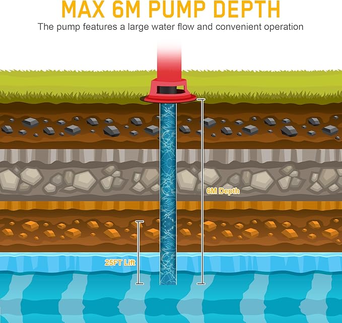- HIGER EFFICIENCY: Inlet pipe diameter: 1-1/4'' NPT, 25ft maximum lift, the hand water pump can extract 6 meters/19.69 feet groundwater to surface in a short time.