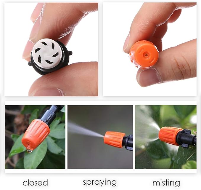 - 【Package】 Include 1 universal faucet connector, 1 screwed faucet connector, 1 Teflon Tape, 20 adjustable misting nozzle , 5 Drip Emitters, 20 fixed stem, 15 adjustable dripper, 20 Barbed Couplings, 20 plug, 20 Barb, 20 Barbed Tee, 20 Flat Tee Pipe Connector, 20 Nylon Cable Ties, 15 meters water pipe and user manual, Reduce water usage and you do not have to worry about your plans whether you are at home or not.In summer,it will provide you a cool outdoor areas.