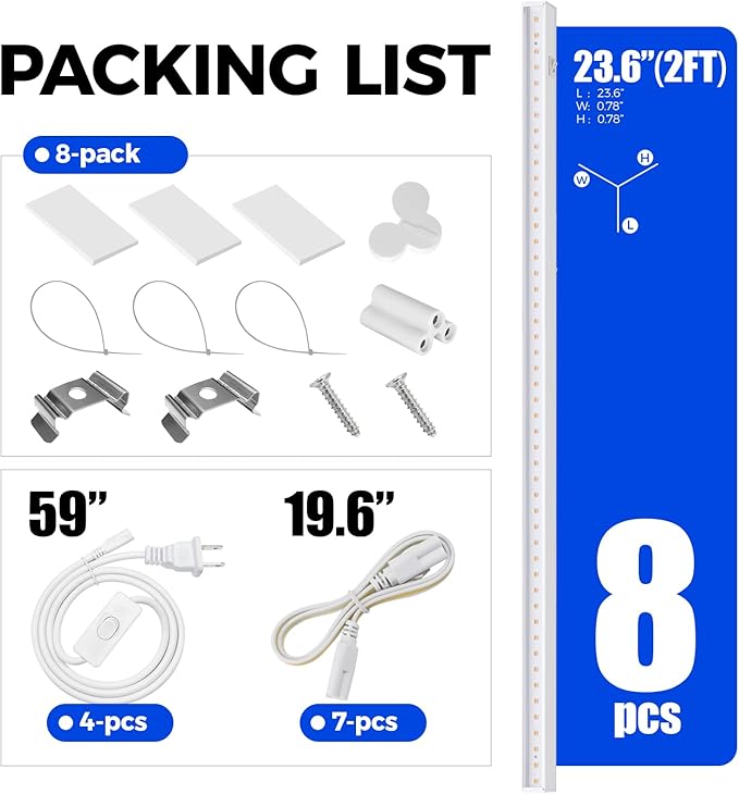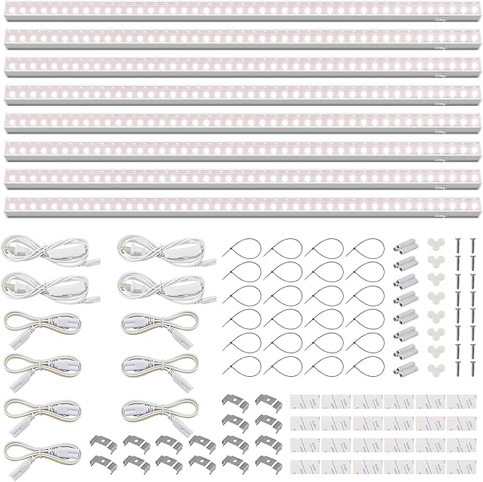 - What You Get:8 x Barrina T5 2ft grow lights, 4 x Power cords with ON/OFF switch, 7x Connecting cords(20''), 8 x Small connectors, 16 x Installation clips, 24 x Double-sided tapes, 24 x Cable ties.