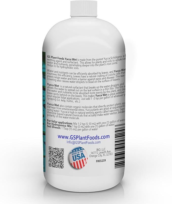 - MADE FROM YUCCA SCHIDIGERA: GS Plant Foods Yucca Wet is made from Yucca Schidigera (60% Saponin), a natural wetting agent and surfactant. This allows for plants and soils to uptake and retain water and nutrients, penetrating deeper into the plant’s root zone. Water and nutrients can be efficiently absorbed by leaves, and Yucca Wet greatly improves this efficiency. Leaves have a natural coating of cuticle cells that help plants retain water and form a barrier against environmental stressors.
