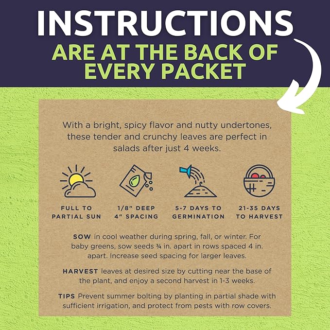 - 10 INDIVIDUAL SEED PACKETS: Red Iceberg Lettuce, Buttercrunch Lettuce, Gourmet Mix Baby Lettuce, Tom Thumb Lettuce, Jericho Romaine Lettuce, Lacinato Kale, Roquette Arugula, Galilee Spinach, Merveille des 4 Saisons Butterhead Lettuce, Red Oakleaf Lettuce