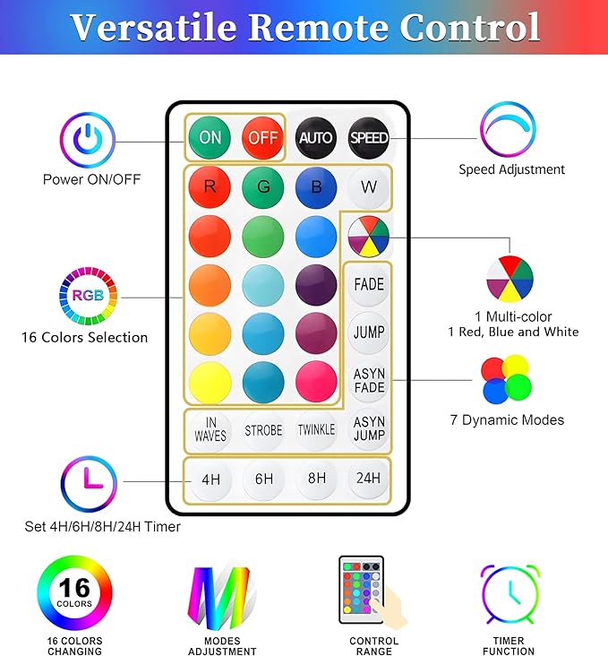 - MEMORY & TIMER FUNCTIONS: Our rope lights are equipped with a multifunctional remote that allows for your customization. With the timer function, you can set the lights to automatically turn off after 4, 6, 8, or 24 hours. The remote also allows you to adjust the speed of the 7 lighting modes with the “speed” button. Additionally, the memory function ensures that the lights will remember your last setting even after being turned off by the remote, eliminating the need to reset them every time.