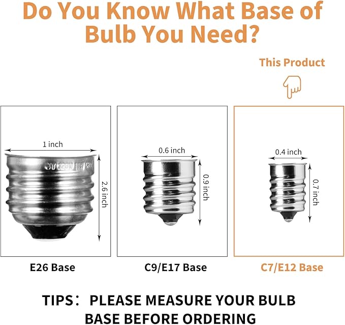 - Fits sockets: E12 or C7 candelabra nickel base which prevent corrosion. Each piece 120V 5W