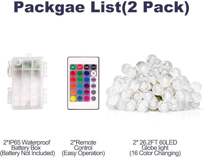 - 【Battery powered&Remote Control】It’s Requires 3 AA batteries (not included) , Each set includes a small IP65 waterproof battery case with around button to adjust the LED Crystal Ball Outdoor String Lights mode. Portable and convenient to take away for any usage. You also can do the Remote Control via the controller for the 16 color changing and 4 dynamic multi-color modes ( Fade / Jump / ASYN Fade / ASYN Jump ) to create a amazing colorful, joyful, romantic atmospheres.