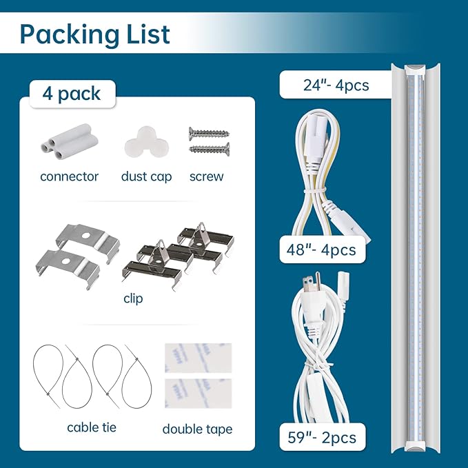 - What You Get - 4 x Barrina LED Grow lights, 2 x Power cords with ON/OFF switch, 3 x Connecting Cords(48''), 4 x Small Connectors, 8x Installation Clips, 8 x Double-sided tape, 16 x cable ties.