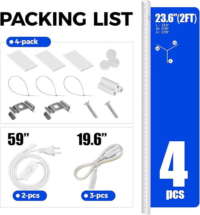 - What You Get: 4 x Barrina T5 Grow lights, 2 x Power cords with ON/OFF switch, 4 x Connecting Cords(20''), 4 x Small Connectors, 8 x Installation Clips, 12 x Double-sided Tapes, 12 x cable ties