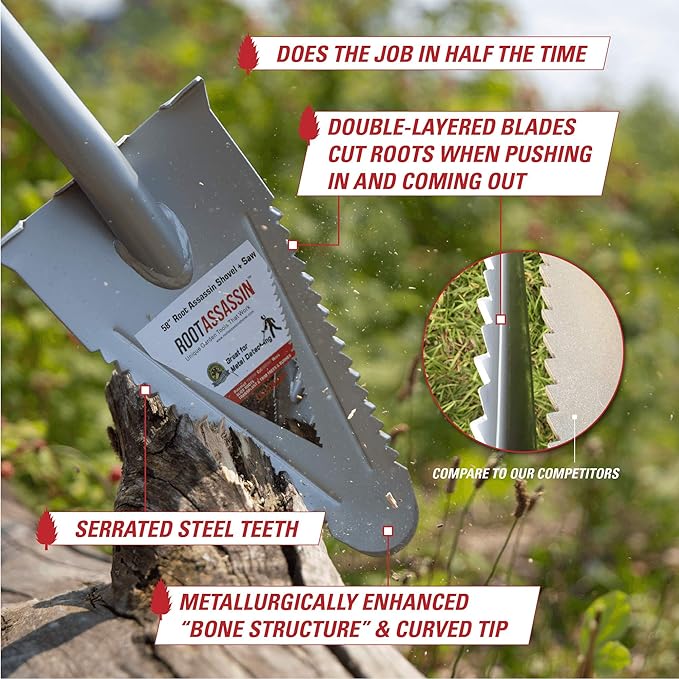 - SAW SPADE COMBO: The Root Assassin Shovel/Saw will do the job in half the time it would take with ordinary tools. Our unique weed-removal shovel includes a metallurgically enhanced “bone structure” and curved tip that is perfect for cutting roots, stumps, and weeds. Because it has sharp beveled teeth in opposite directions on both sides of the head, it can cut roots when going in and coming out.