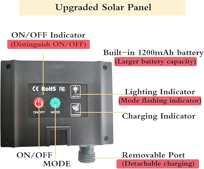 - 【DETACHABLE SOLAR PANEL】100% solar power, solar panels and string lights are removable for separate charging.. The built-in light sensor automatically turns on at dusk and turns off at dawn. The solar panel battery can supply power for more than 10 hours. It does not require a battery and easy to set up. You only need to insert it on the ground to keep the solar panel facing the sun to recharge. It is environmentally and easy to use.
