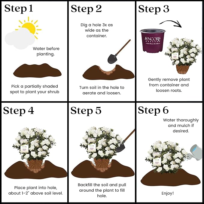 - Product Care Instructions : Turn the soil well and dig a hole twice as wide as it is deep. Mix some organic material with some soil. Put a little bit of this mixture into the hole. Remove the azalea from its container and loosen the root ball lightly with your fingers. Set the plant into your prepared hole, making sure the top of the root ball is slightly above soil level. Make sure the root ball is moist. Pull the soil around the plant, water thoroughly and cover with mulch. Turn the soil well and dig a hole twice as wide as it is deep. Mix some organic material with some soil. Put a little bit of this mixture into the hole. Remove the azalea from its cont… See more