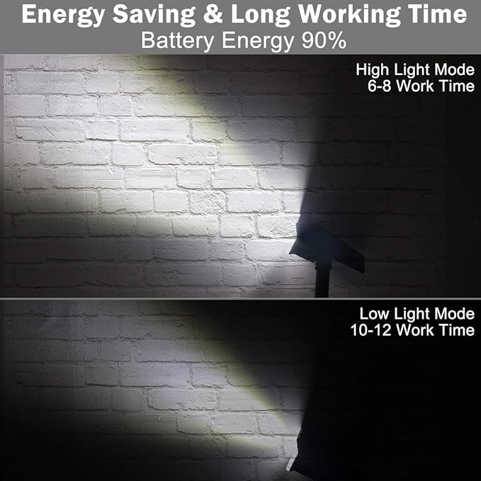 - 2 Lighting Modes: Low light and high light, can be set before install. Solar landscape light can provide about 6-8 hours working (high light mode) or 10-12 hours working (low light mode) after fully charged.