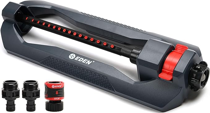 Eden 94113 Lawn & Garden Essential Oscillating Water Sprinkler For Yard W/Quick Connect Starter Set, 16 Nozzles, Covers up to 3,600 sq. ft, Heavy Weight Base