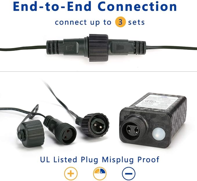 - Timer Function: Activate the timer by long pressing the button on the adaptor for 3 seconds until the timer indicator lights up. Timer keeps the Christmas net lights on for 6 hours and off for 18 hours, freeing your hands and saving energy.