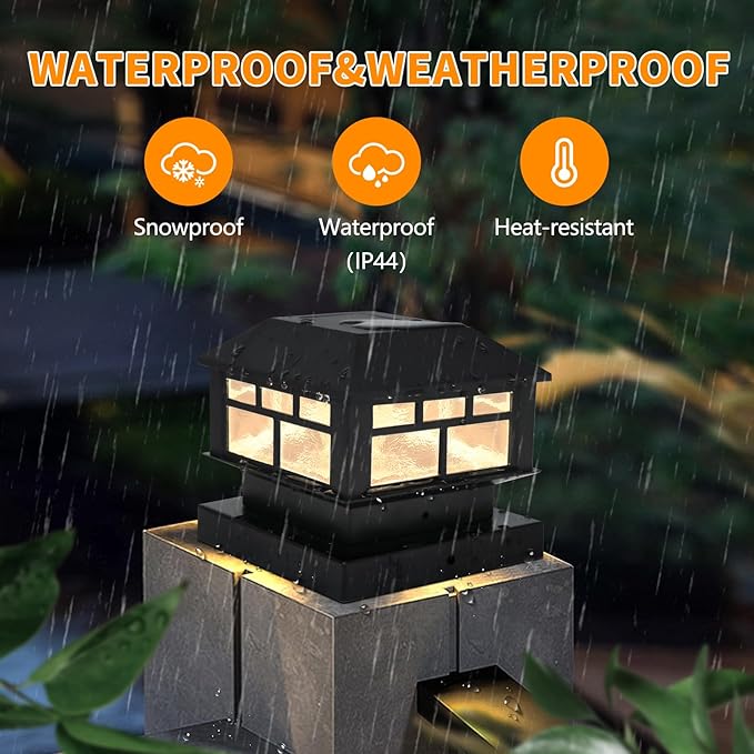 - 【IP44 Waterproof】Solar fence post light has an IP44 waterproof rating and is made of tough ABS. It will withstand harsh heat, heavy downpour, and snow. You can rest assure to use, in any outdoor environments