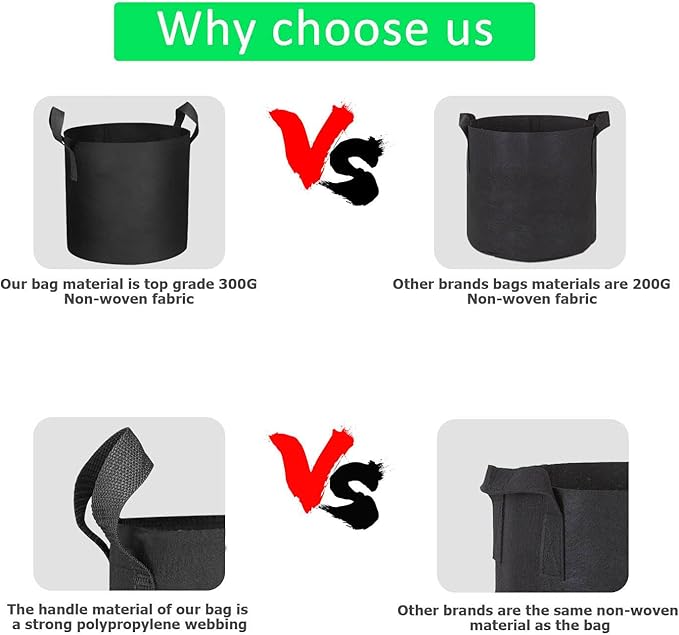 - 【Premium Material】Our grow bags are all made of high quality 300g thicken nonwoven fabric.Exquisite sewing process with five-line edging on the top and double sewing on the side.