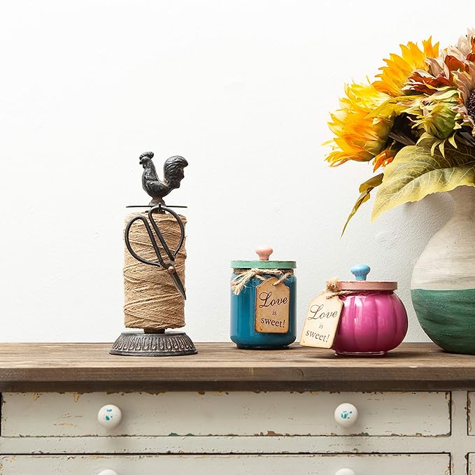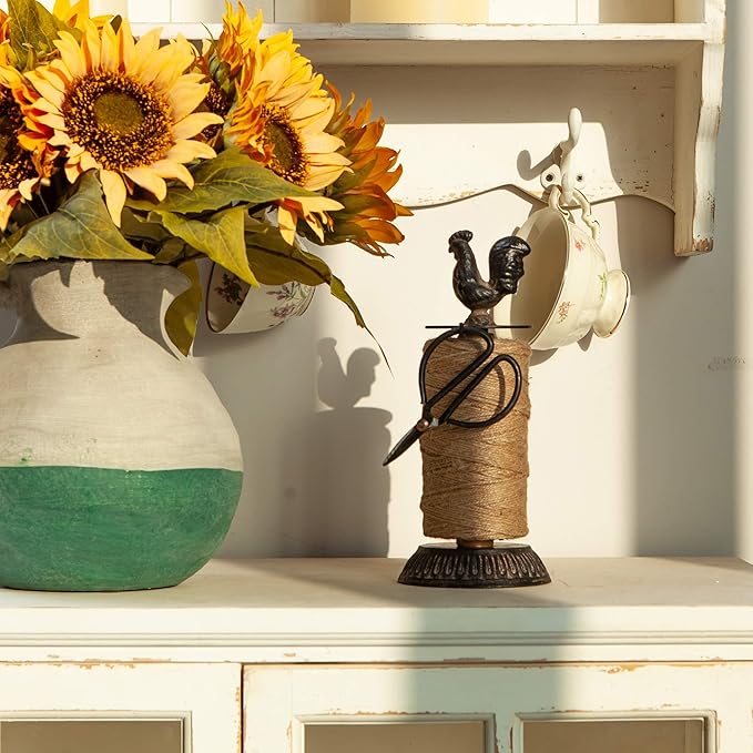 SOFFEE DESIGN Vintage Jute Twine Spool and Scissors Holder for Garden Farmhouse Kitchen Antique Twine and Scissors Set Black Rooster