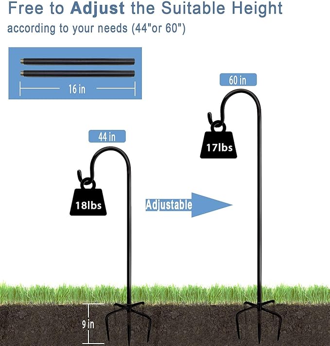 - Extendable & Tall Hook Hanger: The outside shepherd’s hook hanger made of 3/5 inch width & 2mm thickened steel pipe with 5 solid anchor points, you can free to adjust the suitable height for 60 " or 44 ", and also make it stands firmly in the ground without easily falling down, no fear of severe weather such as strong winds, heavy rains, and blizzards, (2 PACK / SET)