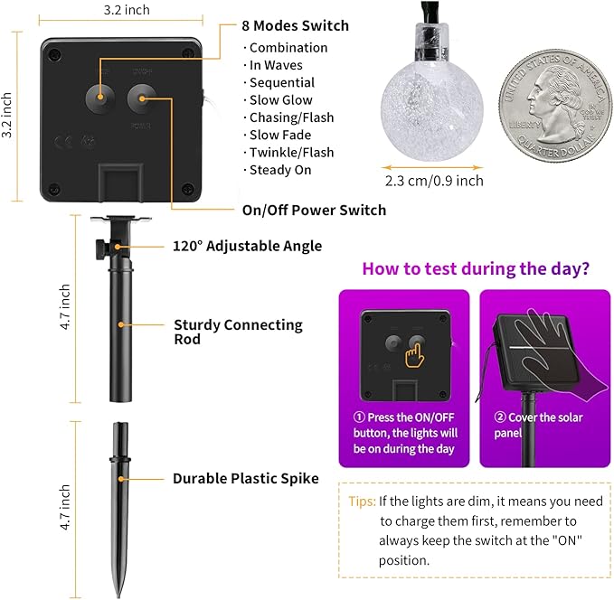 - 【Solar Powered & Auto On/Off】36ft 60 LED string lights, solar energy supply, adjustable monocrystalline silicon solar panel with better conversion rate of energy, no need to replace the battery or extra utility electric cost; Light sensor controls the solar globe lights auto on at dark and auto off at daytime.