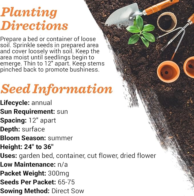 - PLANTING DIRECTIONS: Prepare a bed or container of loose soil. Sprinkle seeds in prepared area and cover loosely with soil. Keep the area moist until seedlings begin to emerge. Thin to 12" apart. Keep stems pinched back to promote bushiness.