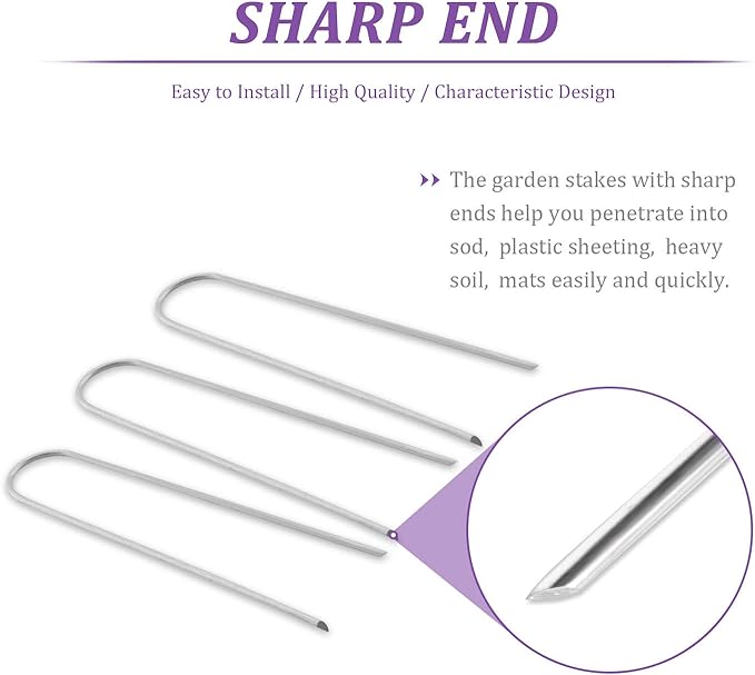 - EFFORTLESS INSTALLATION - With sharp, clean angled ends, our stakes easily penetrate weed barrier mats, plastic sheeting, and even heavy soil, ensuring quick and easy setup.