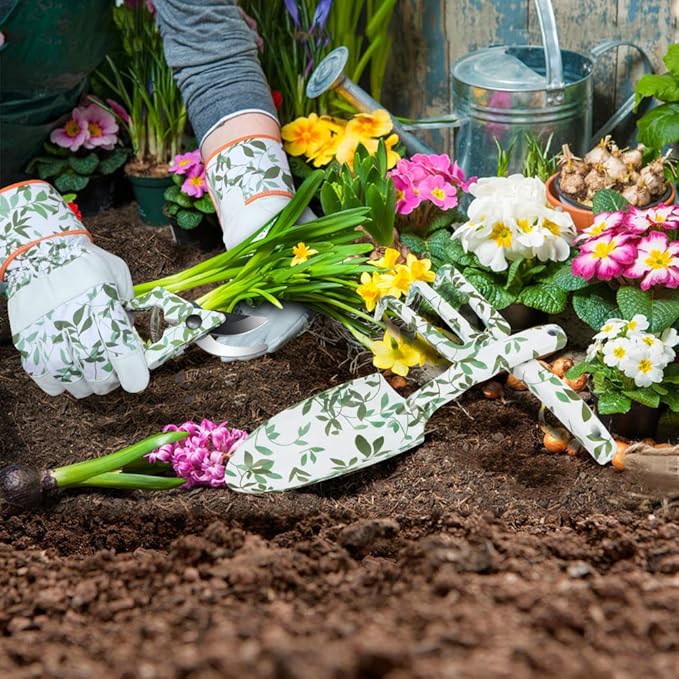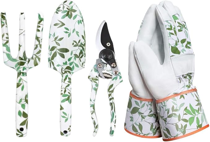 - NICE FLORAL DESIGN: Beautiful Spring leaves printed gardening gloves with goatskin leather and garden tools set