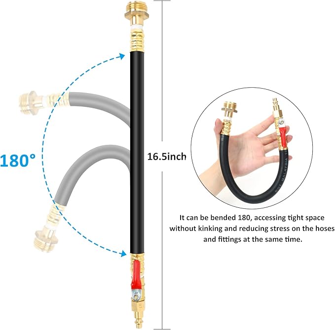 - FOUR HIGH QUALITY PARTS MAKE IT FULLY FUNCTIONAL - This RV winterize kit includes a flexible hose, a shut-off valve with 1/4" Air Compressor quick connect plug, a 3/4" male and female garden hose connectors. These connectors are made of solid brass with excellent strength and durability. While the hose is made of Flexible Reinforced Synthetic Rubber, which is oil and corrosion resistant.