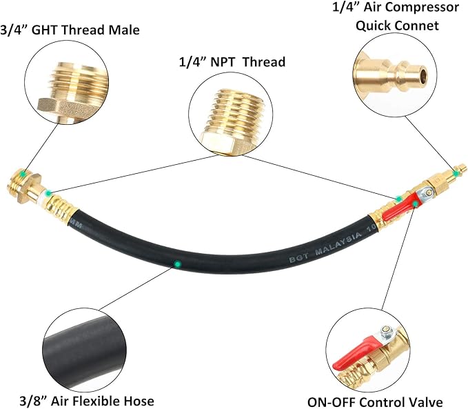 - FLEXIBLE HOSE ENSURES PRACTICALITY AND SAFETY - The pre-assembled length of this hose is about 12 inches, while its width is about 17mm. The hose can be bent 360° without any kink and easily access to all the tight spaces. With this flexible hose, you can not only easily connect the Air Compressor and the garden faucet, but also reduce the stress on the pipes and fittings when working, ensuring safety and long-term usage.